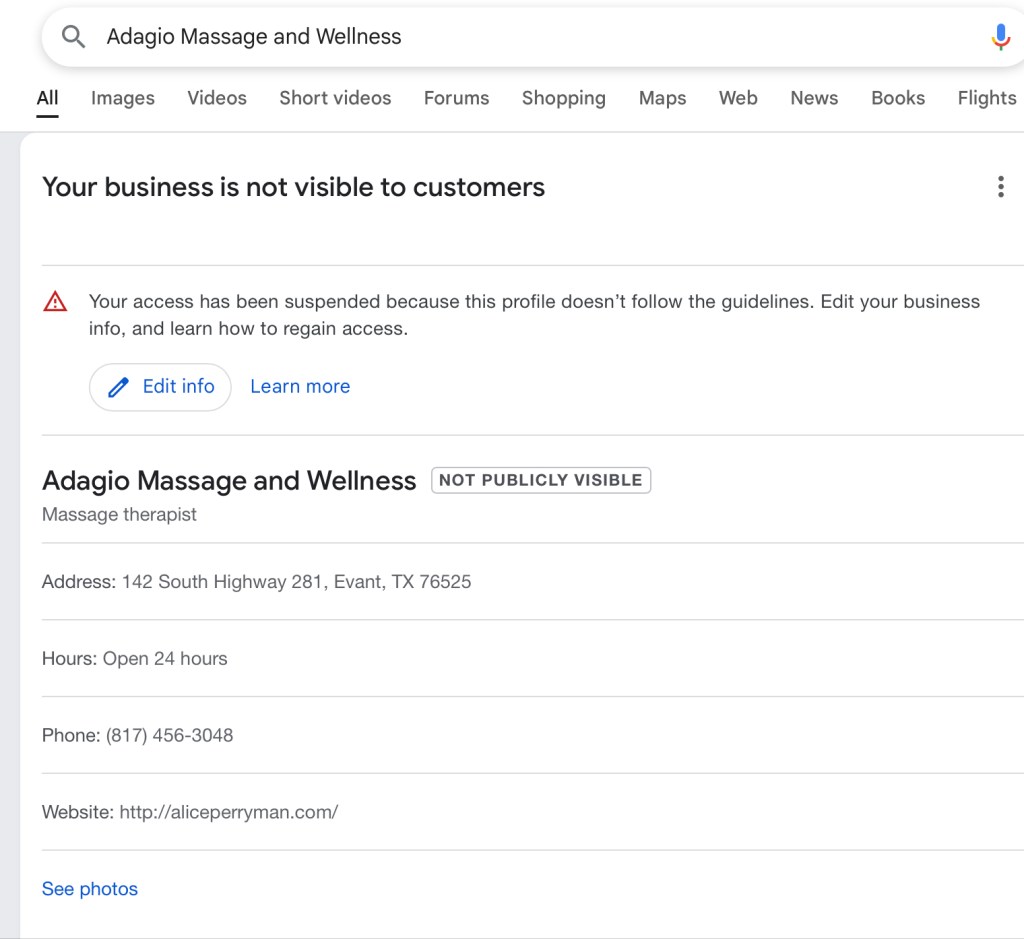 For no apparent reason Google is hiding my business:Adagio Massage and wellness at 142 US Highway 281, Evant, TX 76525. They claim I have Deceptive Marketing practices. I have sent in a video showing I’m the owner of this business and here is what I get back.