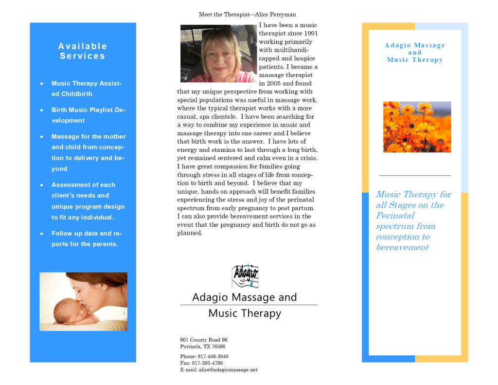 Below is my Music Therapy Assisted Child Birth brochure. I’m still working on a comprehensive brochure for massage therapy but many of the services are listed on my square appointments website with the link above.